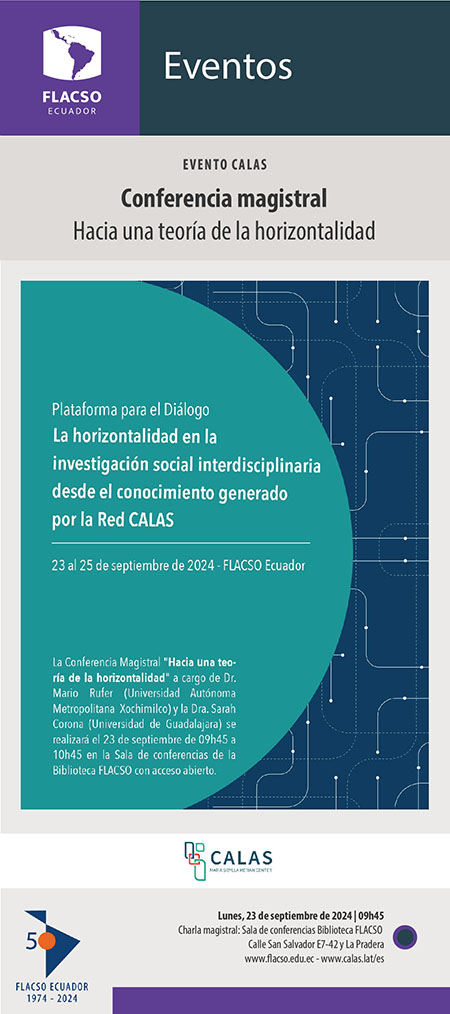 La Plataforma para el Diálogo. La horizontalidad en la investigación social interdisciplinaria desde el conocimiento generado por la Red CALAS invitan a la Conferencia magistral: hacia una teoría de la horizontalidad. Con la participación de: Rufer Mario y Sarah Corona, el lunes 23 de septiembre de 2024 a las 09h45 (hora Ecuador) : FLACSO Ecuador, Quito.