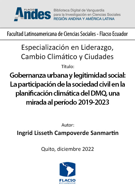 Campoverde Sanmartin, Ingrid Lisseth. 2022. Gobernanza urbana y legitimidad social: La participación de la sociedad civil en la planificación climática del DMQ, una mirada al período 2019-2023. Tesina de especialización, Flacso Ecuador