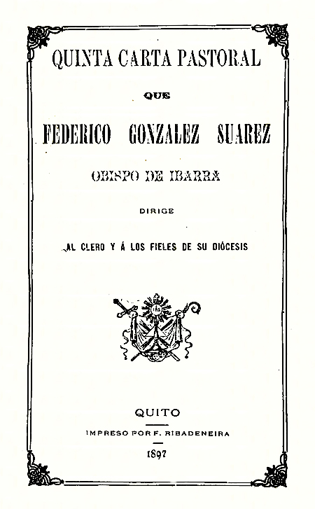González Suárez, Federico. 1897. Quinta carta Pastoral que Federico González Suárez Obispo de Ibarra dirige al Clero y á los fieles de su diócesis. Quito, Ecuador : Impreso por F. Ribadeneira.