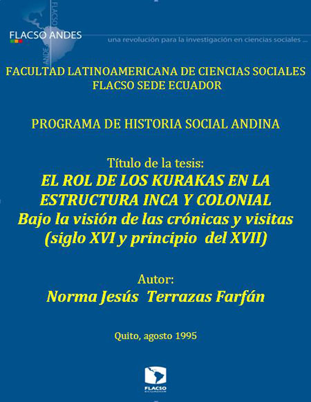 Terrazas Farfán, Norma Jesús (1995). El rol de los kurakas en la estructura inca y colonial, bajo la visión de las crónicas y visitas (siglo XVI y principios del XVII). Maestría en Ciencias Sociales con Mención en Historia Social Andina, FLACSO Sede Ecuador. Quito.
