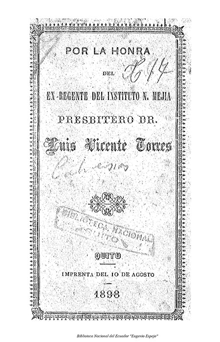 Torres, Luis Vicente. 1898. Por la honra del Ex-Regente del Instituto N. Mejía Presbítero Dr. Luis Vicente Torres. Quito : s. e.