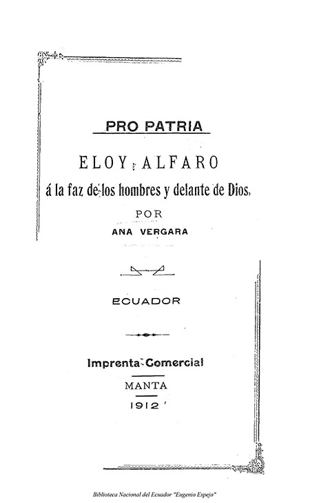 Vergara, Ana. 1912. Pro-Patria: Eloy Alfaro á la faz de los hombres y delante de Dios. Manta : Imprenta Comercial .