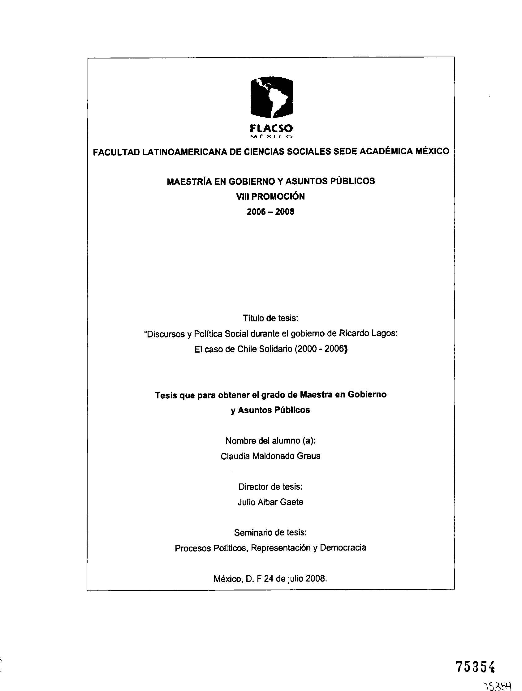Maldonado Graus, Claudia (2008). Discursos y política social durante el gobierno de Ricardo Lagos : el caso de Chile Solidario (2000-2006). Maestría en Gobierno y Asuntos Públicos; FLACSO - Sede Académica de México. México. 141 h.