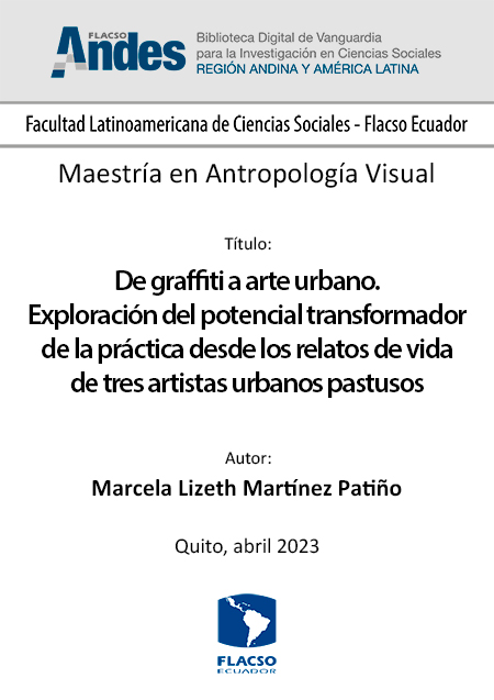 Martínez Patiño, Marcela Lizeth. 2023. De graffiti a arte urbano. Exploración del potencial transformador de la práctica desde los relatos de vida de tres artistas urbanos pastusos. Tesis de maestría, Flacso Ecuador.