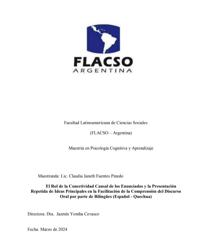 Fuentes Pinedo, Claudia Janeth (2024). El rol de la conectividad causal de los enunciados y la presentación repetida de ideas principales en la facilitación de la comprensión del discurso oral por parte de bilingües (español - quechua). Tesis de Maestría. FLACSO. Sede Académica Argentina, Buenos Aires.