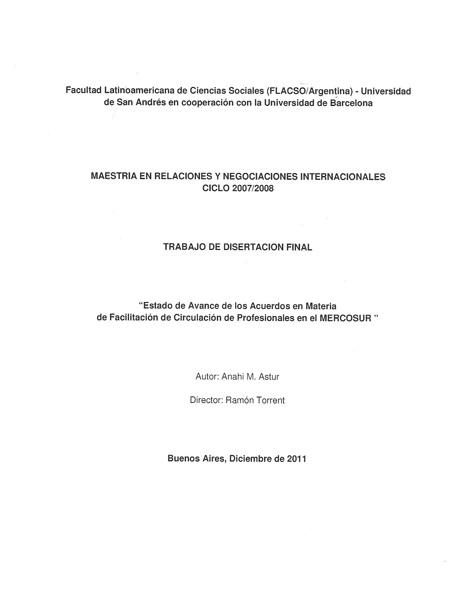 Astur, Anahí Marina (2012). Estado de avance de los acuerdos en materia de Facilitación de Circulación de Profesionales en el MERCOSUR. Tesis de Maestría. Buenos Aires: FLACSO. Sede Académica Argentina, Universidad de San Andrés, Universitat de Barcelona, Buenos Aires.