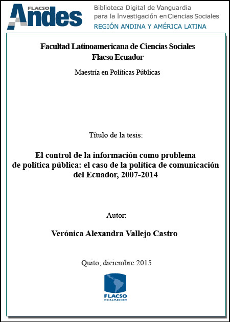 Vallejo Castro, Verónica Alexandra. 2015. El control de la información como problema de política pública: el caso de la política de comunicación del Ecuador, 2007-2014. Tesis de maestría, Flacso Ecuador.