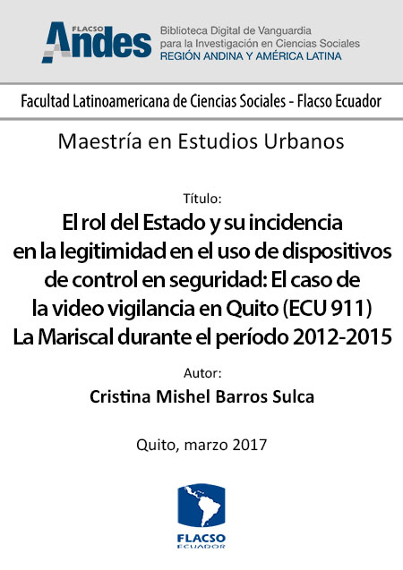 Barros Sulca, Cristina Mishel. 2017. El rol del Estado y su incidencia en la legitimidad en el uso de dispositivos de control en seguridad: El caso de la video vigilancia en Quito (ECU 911) Barrio La Mariscal durante el período 2012-2015. Tesis de maestría, Flacso Ecuador.