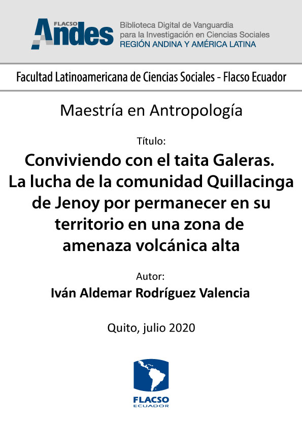 Rodríguez Valencia, Iván Aldemar. 2020. Conviviendo con el taita Galeras. La lucha de la comunidad Quillacinga de Jenoy por permanecer en su territorio en una zona de amenaza volcánica alta. Tesis de maestría, Flacso Ecuador.