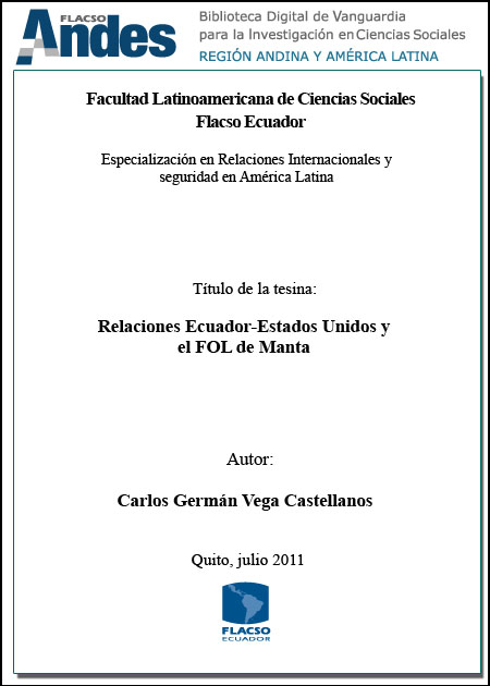 Vega Castellanos, Carlos Germán. 2011. Relaciones Ecuador-Estados Unidos y el FOL de Manta. Tesina de especialización, Flacso Ecuador.