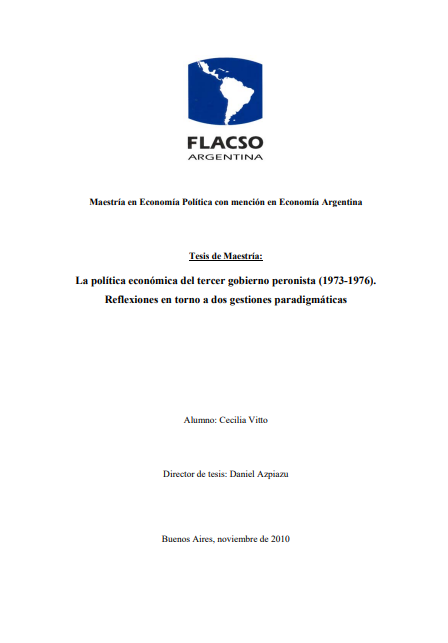 Vitto, Cecilia Nilda (2010). La política económica del tercer gobierno peronista (1973-1976) : reflexiones en torno a dos gestiones paradigmáticas. Tesis de Maestría. FLACSO. Sede Académica Argentina, Buenos Aires.