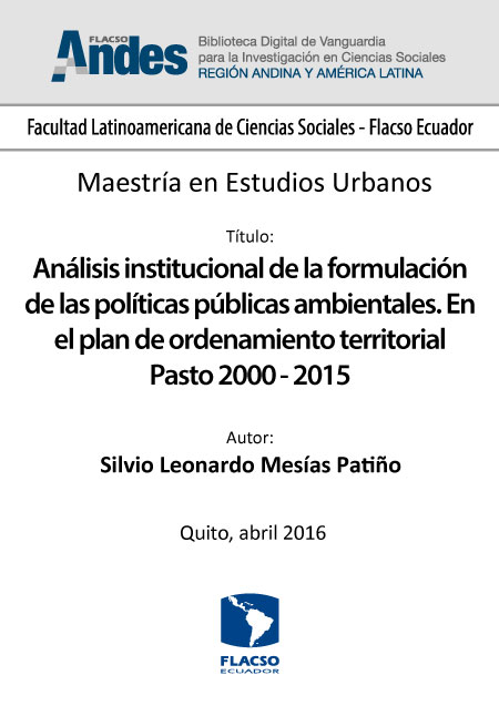 Mesías Patiño, Silvio Leonardo. 2016. Análisis institucional de la formulación de las políticas públicas ambientales. En el plan de ordenamiento territorial Pasto 2000 - 2015. Tesis de maestría, Flacso Ecuador.