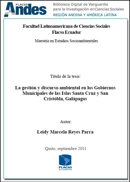 Reyes Parra, Leidy Marcela. 2011. La gestión y discurso ambiental en los gobiernos municipales de las islas Santa Cruz y San Cristóbal, Galápagos. Tesis de maestría, Flacso Ecuador.