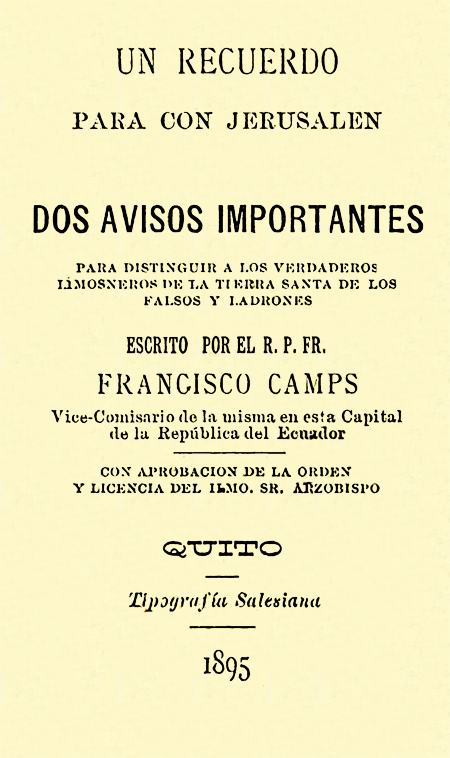 Un recuerdo para con Jerusalén y dos avisos importantes : para distinguir a los verdaderos limosneros de la Tierra Santa de los falsos y ladrones escrito por el R. P. Francisco Camps vice/comisario de la misma en esta Capital de la República del Ecuador, con aprobación de la orden y licencia del Ilmo. Sr. Arzobispo (Folleto).