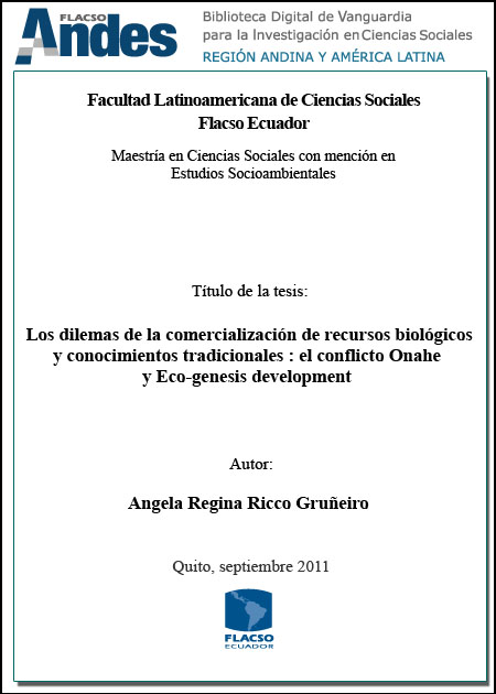 Ricco Gruñeiro, Angela Regina. 2011. Los dilemas de la comercialización de recursos biológicos y conocimientos tradicionales: el conflicto Onahe y eco-génesis development. Tesis de maestría, Flacso Ecuador.
