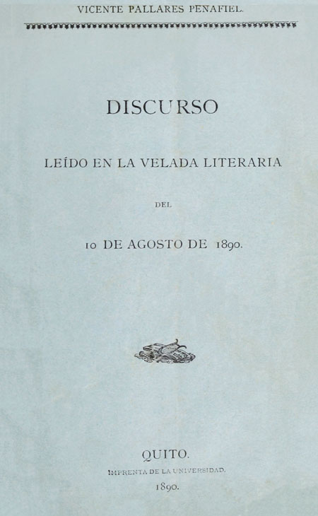 Pallares Peñafiel, Vicente. 1890. Discurso leído en la velada literaria del 10 de agosto de 1890. Quito, Ecuador : Imprenta de la Universidad.