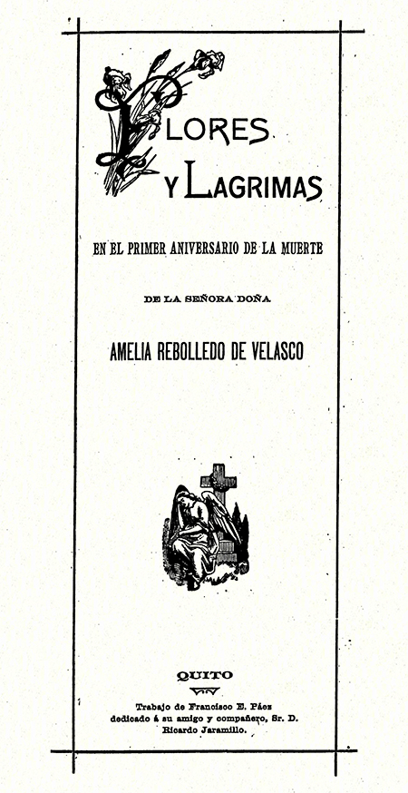 Páez, Francisco E. 1910. Flores y lágrimas en el primer aniversario de la muerte de la señora doña Amelia Rebolledo de Velasco. Quito, Ecuador : Editorial sin registrar.