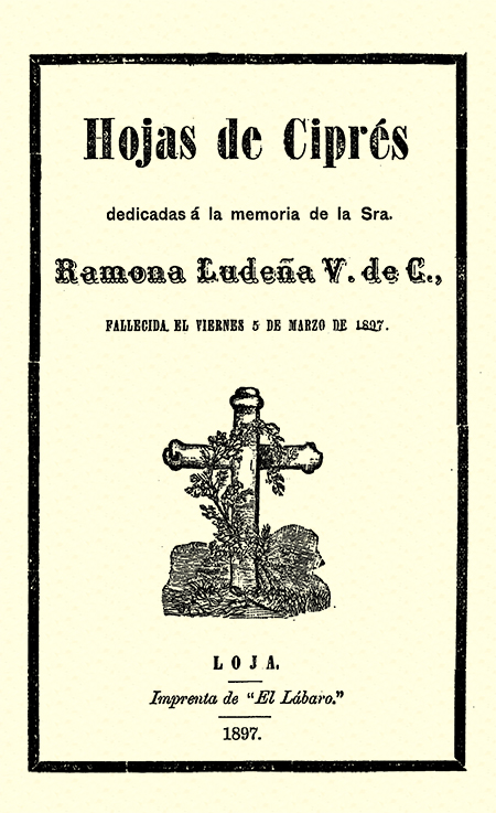 1897. Hojas de Ciprés dedicadas a la memoria de la sra. Ramona Ludeña V. de C., fallecida el viernes 5 de marzo de 1897. Loja, Ecuador : Imprenta de "El Lábaro".