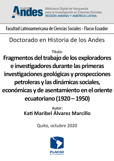 Álvarez Marcillo, Kati Maribel. 2020. Fragmentos del trabajo de los exploradores e investigadores durante las primeras investigaciones geológicas y prospecciones petroleras y las dinámicas sociales, económicas y de asentamiento en el oriente ecuatoriano (1920 – 1950). Tesis de doctorado, Flacso Ecuador.