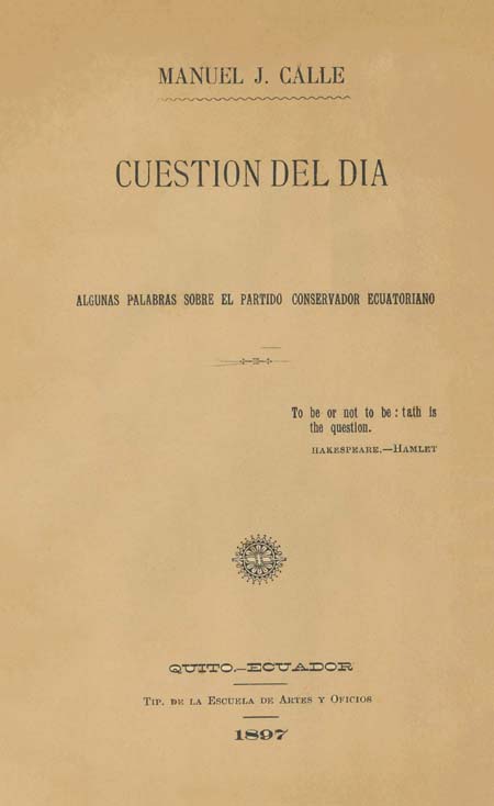 Calle, Manuel J. 1897. Cuestión del día: algunas palabras sobre el Partido Conservador Ecuatoriano. Quito, Ecuador : Tip. de la Escuela de Artes y Oficios.