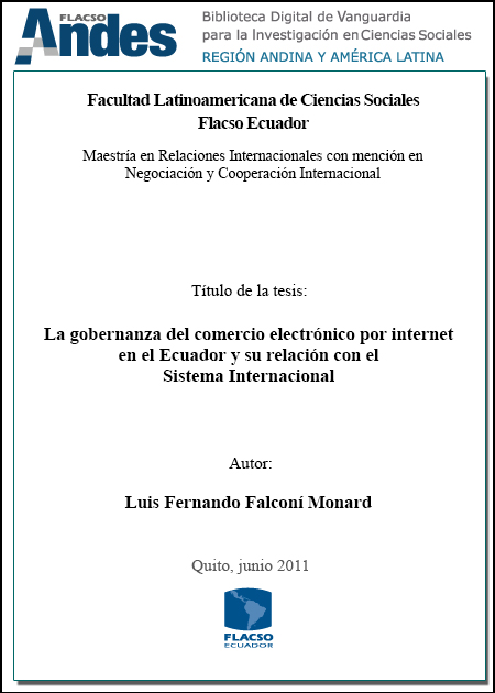 Falconí Monard, Luis Fernando. 2011. La gobernanza del comercio electrónico por internet en el Ecuador y su relación con el Sistema Internacional. Tesis de maestría, Flacso Ecuador.