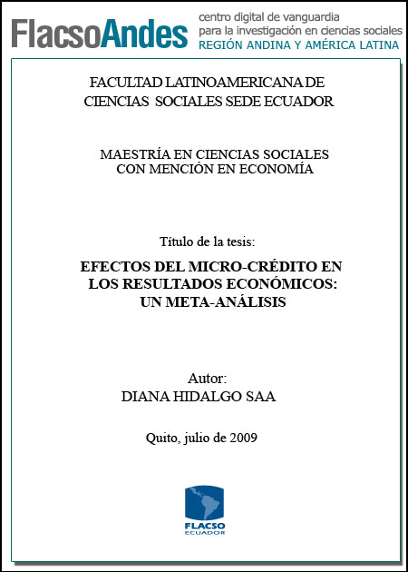 Hidalgo Saa, Diana (2009). Effects of micro-credits on economic outcomes : a meta analysis = Efectos del micro-crédito en los resultados económicos : un meta-análisis. Maestría en Ciencias Sociales con mención en Economía del Desarrollo. FLACSO, Sede Ecuador. Quito. 54 p