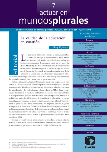 La política en educación primaria y media, siguiendo a M. Luna y A. Astorga se ha caracterizado en las últimas tres décadas por la ampliación de la oferta privada y por los intentos focalizados de reforma a través de proyectos del Banco Mundial y del Banco Interamericano de Desarrollo los cuales declaraban como objetivos la mejora de logros académicos, la formación docente, la autonomía administrativa de las escuelas y la focalización. En este número analizamos la situación de los esfuerzos por mejorar la calidad de la educación y constatamos que los resultados son más bien contrarios a lo que se esperaba. En la sección Actores, Patricio Rivas analiza las diversas acepciones de calidad en la educación que son elaboradas por actores del sector, lo que nos permite sopesar las dificultades en la formación de acuerdos sobre los conceptos, las metodologías y los indicadores de calidad educativa. Milton Luna enmarca esta discusión en el papel que podría tener la sociedad civil para contribuir a la proposición de políticas enmarcadas en una concepción de derechos. El análisis que realiza David Post sobre la situación de la educación y el trabajo infantil permite comparar la situación de Ecuador frente a Chile, Colombia y Perú, a partir de los datos provenientes del Segundo Estudio Regional Comparativo y Explicativo (SERCE). Rolando Franco nos permite situar la política educativa en el contexto de la política social y el desarrollo de los países. Asimismo se incluye un artículo de Verónica Puruncajas sobre el sistema de formación docente en Ecuador en el que se cuestionan las reformas introducidas en 1991.