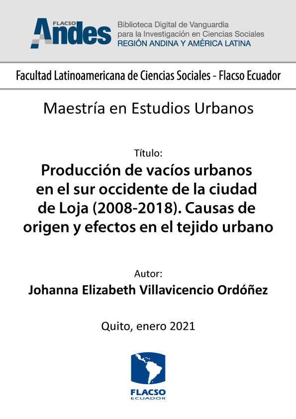Villavicencio Ordóñez, Johanna Elizabeth. 2021. Producción de vacíos urbanos en el sur occidente de la ciudad de Loja (2008-2018). Causas de origen y efectos en el tejido urbano. Tesis de maestría, Flacso Ecuador.