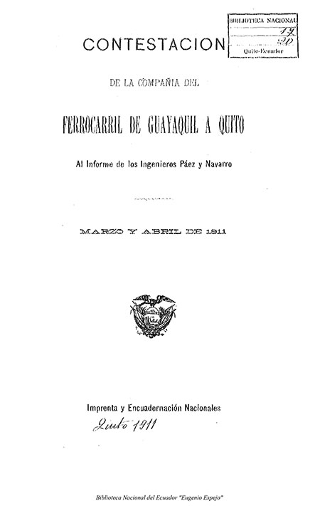 Contestación de la Compañía del Ferrocarril de Guayaquil a Quito al informe de los Ingenieros Páez y Navarro, Marzo y Abril de 1911. Quito : Imprenta y Encuadernación Nacionales.
