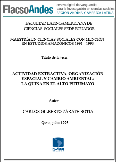 Zárate Bottía, Carlos Gilberto (1993). Actividad extractiva, organización espacial y cambio ambiental: la quina en el Alto Putumayo. Maestría en Ciencias Sociales con mención en Estudios Amazónicos Putumayo, FLACSO Sede Ecuador. Quito 94 p.