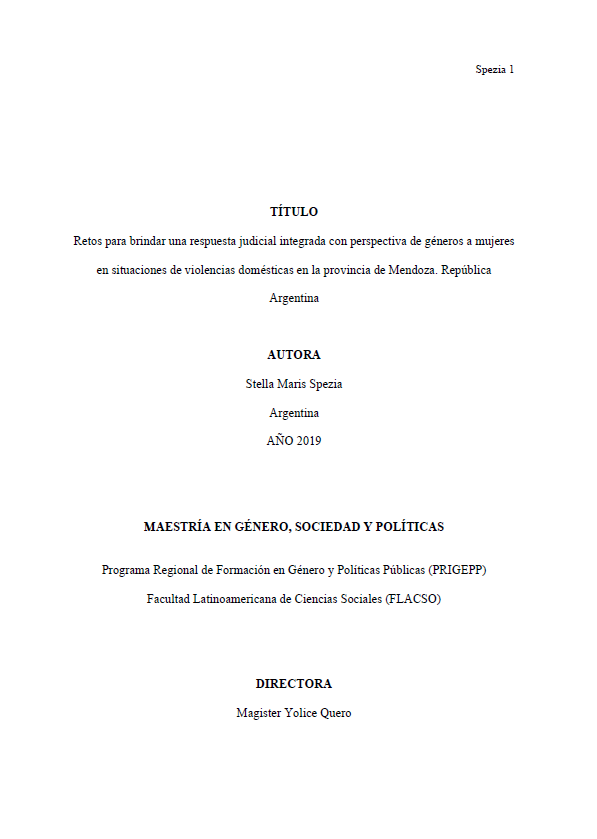 Spezia, Stella Maris. (2019). Retos para brindar una respuesta judicial integrada con perspectiva de géneros a mujeres en situaciones de violencias domésticas en la provincia de Mendoza. República Argentina. Tesis de Maestría. FLACSO. Sede Académica Argentina, Buenos Aires.