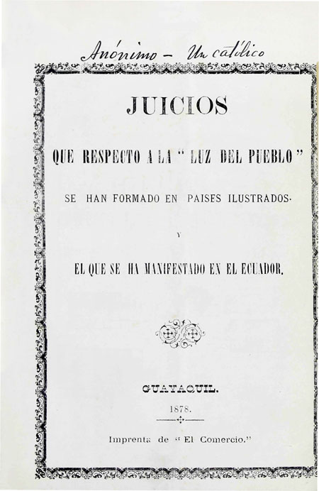1878. Juicios que respecto a la luz del pueblo se han formado en países ilustrados. Y el que se ha manifestado en el Ecuador. Guayaquil, Ecuador : Imprenta de El Comercio.