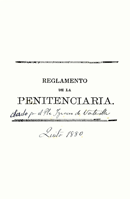 Veintemilla, Ignacio. 1880. Reglamento de la Penitenciaria. [ Ciudad sin identificar ] : [ Editorial sin identificar ].