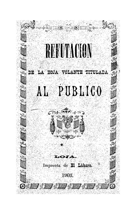 Carrión, Alejandro. 1903. Refutación de la hoja volante titulada al público. Loja : Imprenta de El Lábaro