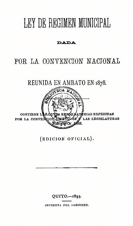 Convención Nacional. 1879. Ley de Régimen Municipal dada por la Convención Nacional reunida en Ambato en 1878. Quito, Ecuador : Imprenta Nacional.