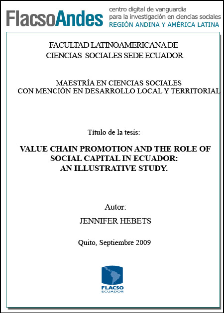 Hebets, Jennifer (2009). Value chain promotion and the role of Social Capital in Ecuador : an illustrative study. Maestría en Ciencias Sociales con mención en Desarrollo local y Territorio; FLACSO - Sede Ecuador. Quito. 116 p.