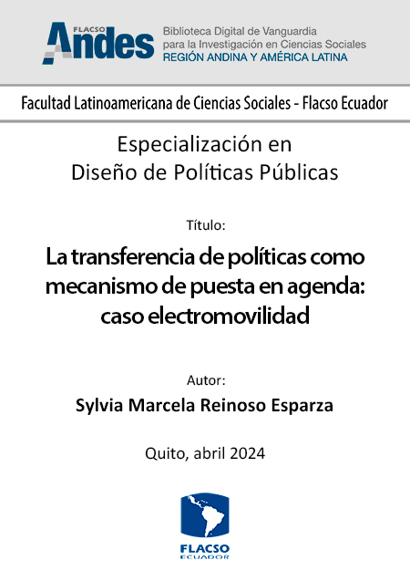 Reinoso Esparza, Sylvia Marcela. 2024. La transferencia de políticas como mecanismo de puesta en agenda: caso electromovilidad. Tesina de especialización, Flacso Ecuador.