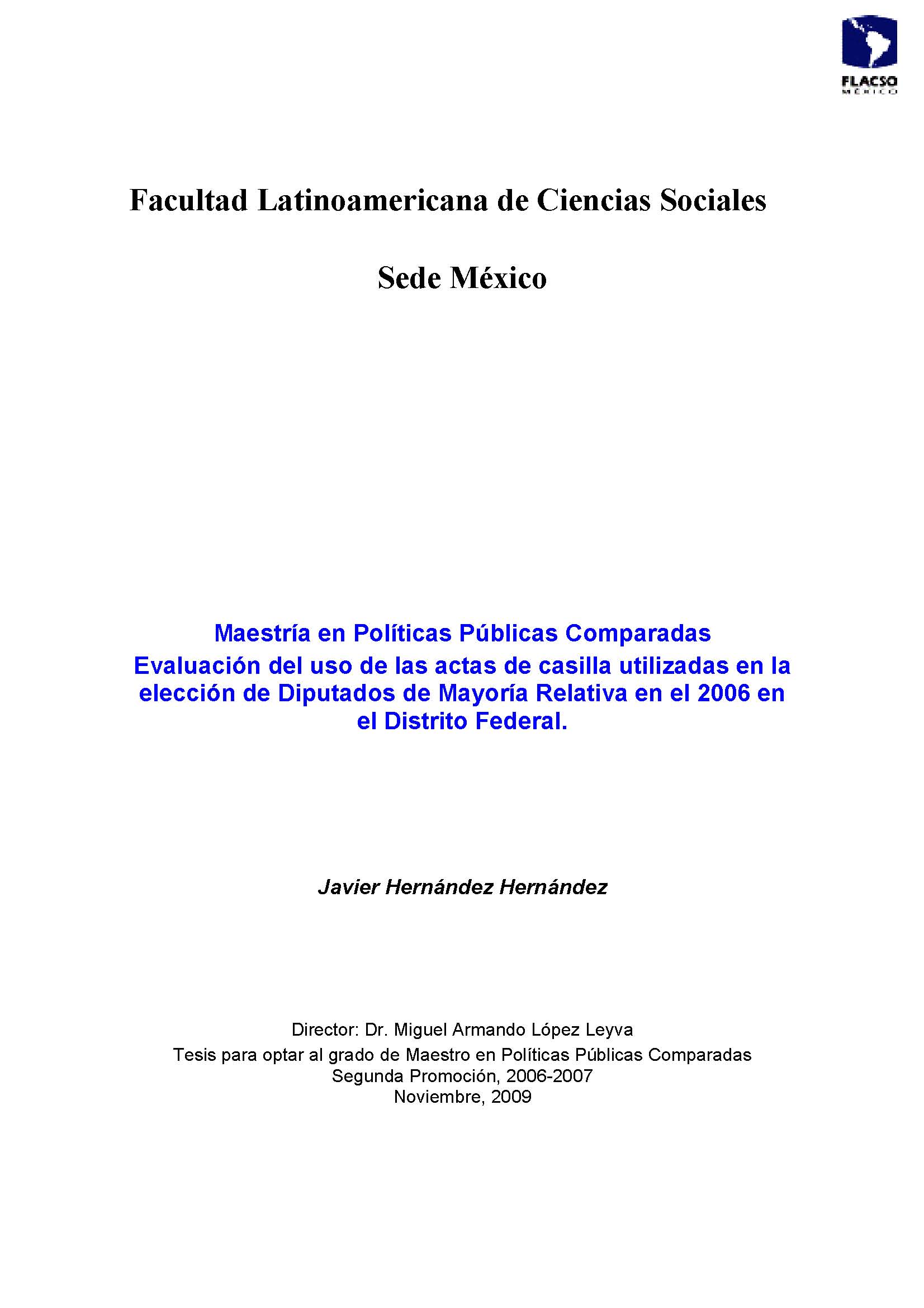 Hernández Hernández, Javier (2009). Evaluación del uso de las actas de casilla utilizadas en la elección de Diputados de Mayoría Relativa en el 2006 en el Distrito Federal. Maestría en Políticas Públicas Comparadas; FLACSO – Sede Académica de México. México. 65 [47] h.