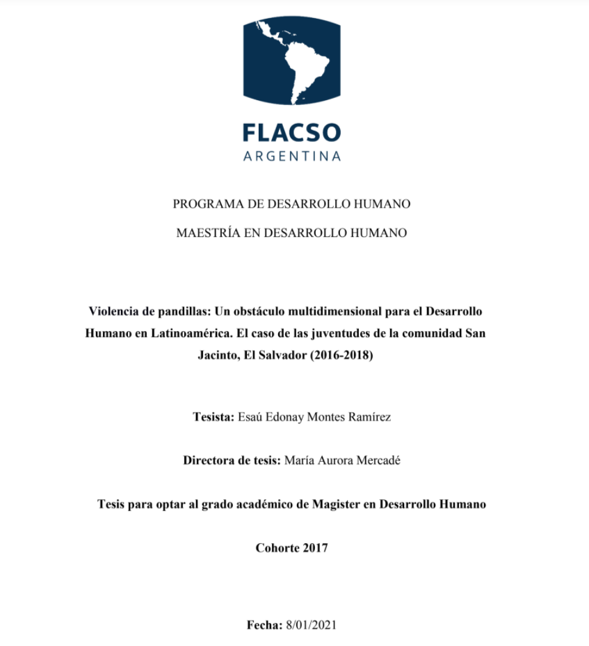 Montes Ramírez, Esaú Edonay. (2021). Violencia de pandillas : un obstáculo multidimensional para el desarrollo humano en Latinoamérica : el caso de las juventudes de la comunidad San Jacinto, El Salvador (2016-2018). Tesis de Maestría. FLACSO. Sede Académica Argentina, Buenos Aires.