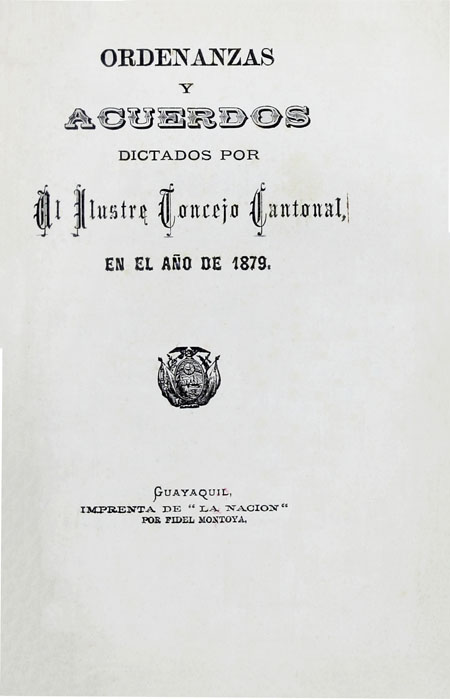 Concejo Cantonal de Guayaquil. 1879. Ordenanzas y acuerdos dictados por el ilustre Concejo Cantonal en el año de 1879. Guayaquil, Ecuador : Imp. de "La Nación", por Fidel Montoya.