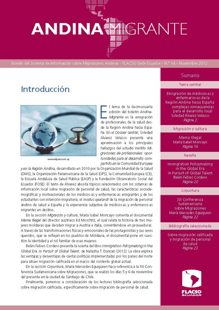El tema de la decimocuarta edición del boletín Andina-Migrante es la emigración de profesionales de la salud desde la Región Andina hacia España. En el Dossier central, Soledad Álvarez Velasco presenta una aproximación a los principales hallazgos del estudio inédito Migraciones de profesionales. El texto de Álvarez aborda tópicos relacionados con los sistemas de información local sobre migración de personal de salud, las características sociodemográficas y motivacionales de los médicos-as y enfermeras-as emigrantes y de los estudiantes con intención migratoria. En la sección Migración y cultura, María Isabel Moncayo comenta el documental Mama Illegal del director austriaco Ed Moschitz, el cual relata la historia de tres mujeres moldavas que deciden migrar a Austria e Italia, convirtiéndose en proveedoras. Belén Febres Cordero presenta la reseña del libro Immigration Policymaking in the Global Era. In Pursuit of Global Talent, de Natasha T. Duncan (2012). La obra explora las ventajas y desventajas de ciertas políticas implementadas por los países del norte para atraer migración calificada en el marco del contexto global actual. En la sección Coyuntura, María Mercedes Eguiguren hace referencia a la XII Conferencia Sudamericana sobre Migraciones, que se realizó los días 5 y 6 de noviembre del presente en la ciudad de Santiago de Chile. Finalmente, ponemos a consideración de los lectores bibliografía seleccionada sobre migración calificada, específicamente sobre migración de personal de salud.
