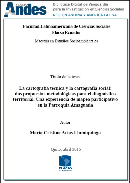 Arias Llumiquinga, María Cristina. 2015. La cartografía técnica y la cartografía social: dos propuestas metodológicas para el diagnóstico territorial. Una experiencia de mapeo participativo en la Parroquia Amaguaña. Tesis de maestría, Flacso Ecuador.