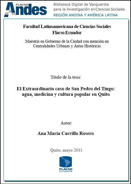 Carrillo Rosero, Ana María. 2011. El Extraordinario caso de San Pedro del Tingo: agua, medicina y cultura popular en Quito. Tesis de maestría, Flacso Ecuador.