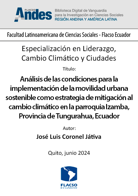 Coronel Játiva, José Luis. 2024. Análisis de las condiciones para la implementación de la movilidad urbana sostenible como estrategia de mitigación al cambio climático en la parroquia Izamba, Provincia de Tungurahua, Ecuador. Tesina de especialización, Flacso Ecuador.