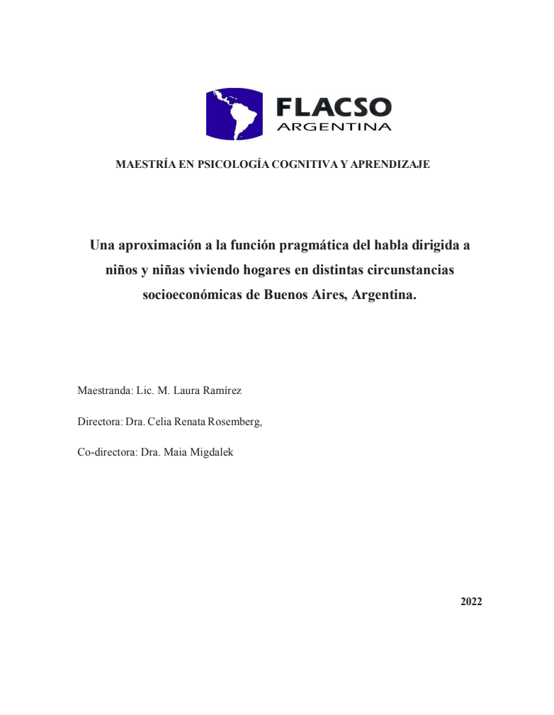Ramírez, María Laura (2022). Una aproximación a la función pragmática del habla dirigida a niños y niñas viviendo hogares en distintas circunstancias socioeconómicas de Buenos Aires, Argentina. Tesis de Maestría. FLACSO. Sede Académica Argentina, Buenos Aires.