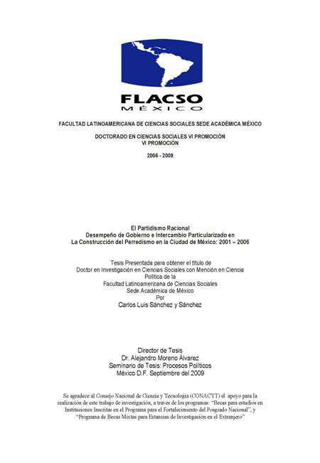 Sánchez y Sánchez, Carlos Luis (2009). El partidismo racional : desempeño de gobierno e intercambio particularizado en la construcción del perredismo en la Ciudad de México : 2001-2006. Doctorado de Investigación en Ciencia Sociales con Mención en Ciencia Política; FLACSO – Sede Académica de México. México. 360 p.
