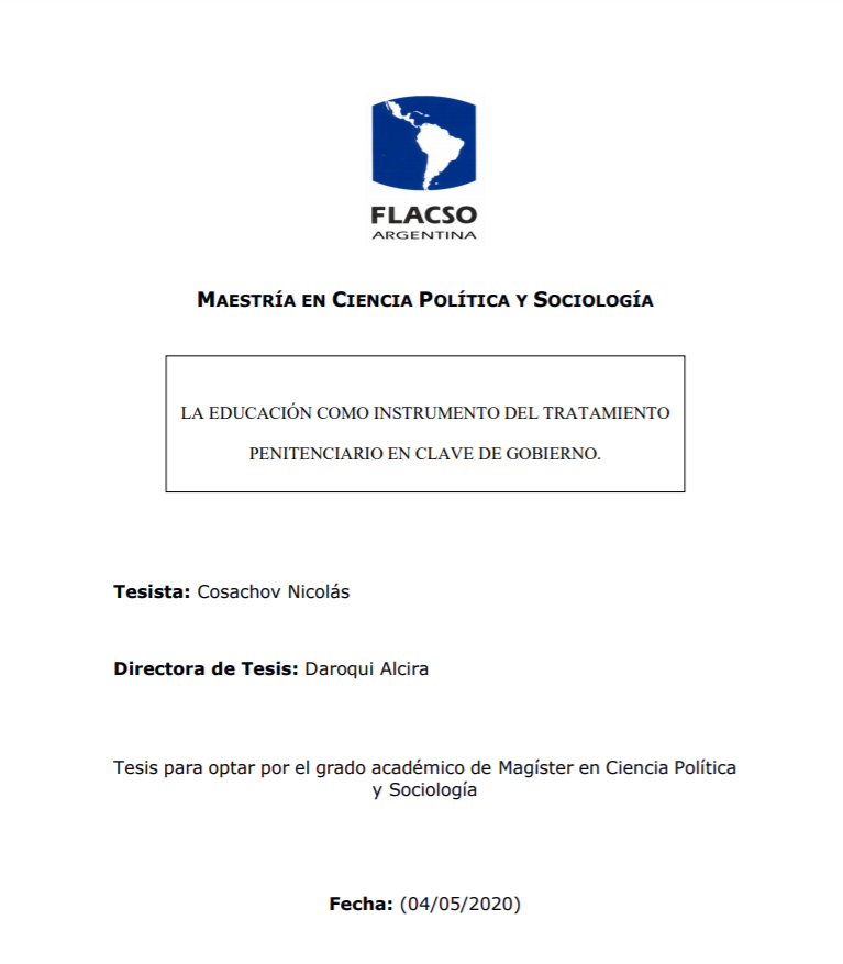 Cosachov, Nicolás. (2020). La educación como instrumento del tratamiento penitenciario en clave de gobierno. Tesis de Maestría. FLACSO. Sede Académica Argentina, Buenos Aires.