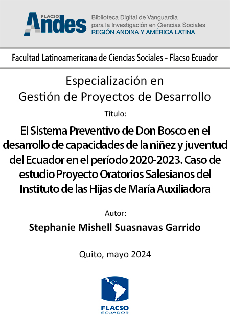 Suasnavas Garrido, Stephanie Mishell. 2024. El Sistema Preventivo de Don Bosco en el desarrollo de capacidades de la niñez y juventud del Ecuador en el período 2020-2023. Caso de estudio Proyecto Oratorios Salesianos del Instituto de las Hijas de María Auxiliadora. Tesina de especialización, Flacso Ecuador.