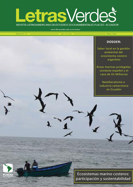 Letras Verdes. Revista Latinoamericana de Estudios Socioambientales FLACSO - Ecuador. Ecosistemas marino costeros : participación y sustentabilidad. Quito, 15, 78 p., marzo 2014. ISSN: 1390-6631.