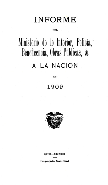 Ministerio del Interior. 1909. Informe del Ministerio de lo Interior, Policía, Beneficencia, Obras Públicas, & a la Nación en 1909. Quito, Ecuador : Imprenta Nacional.
